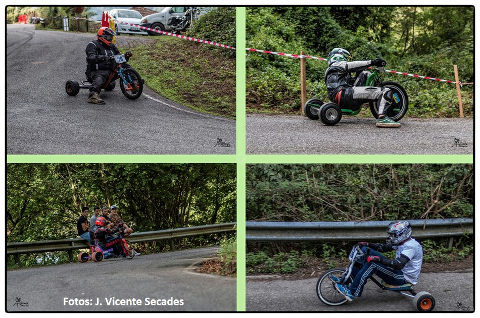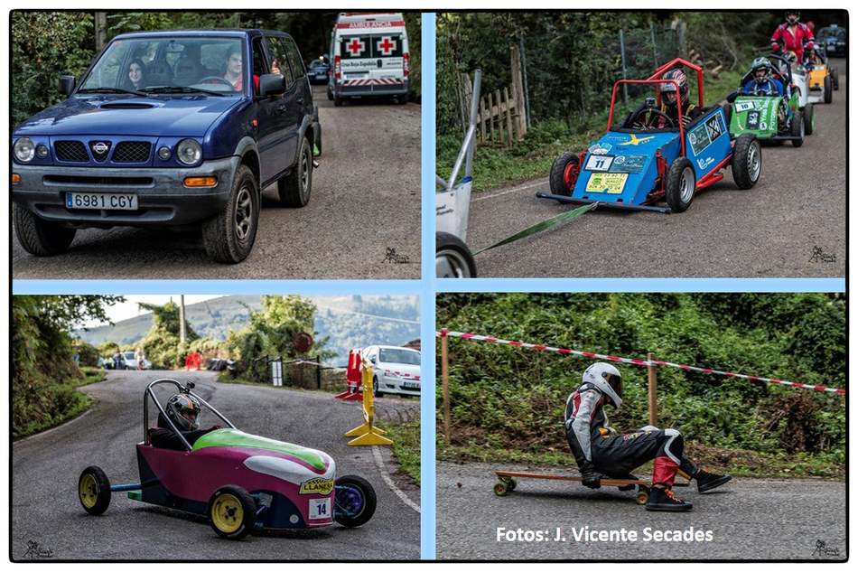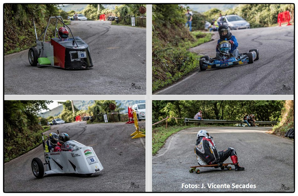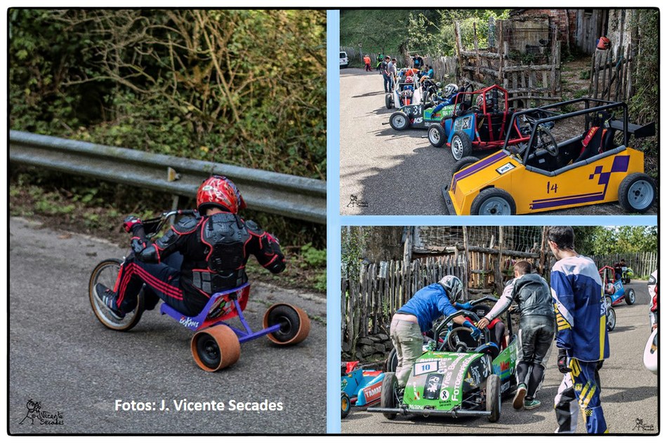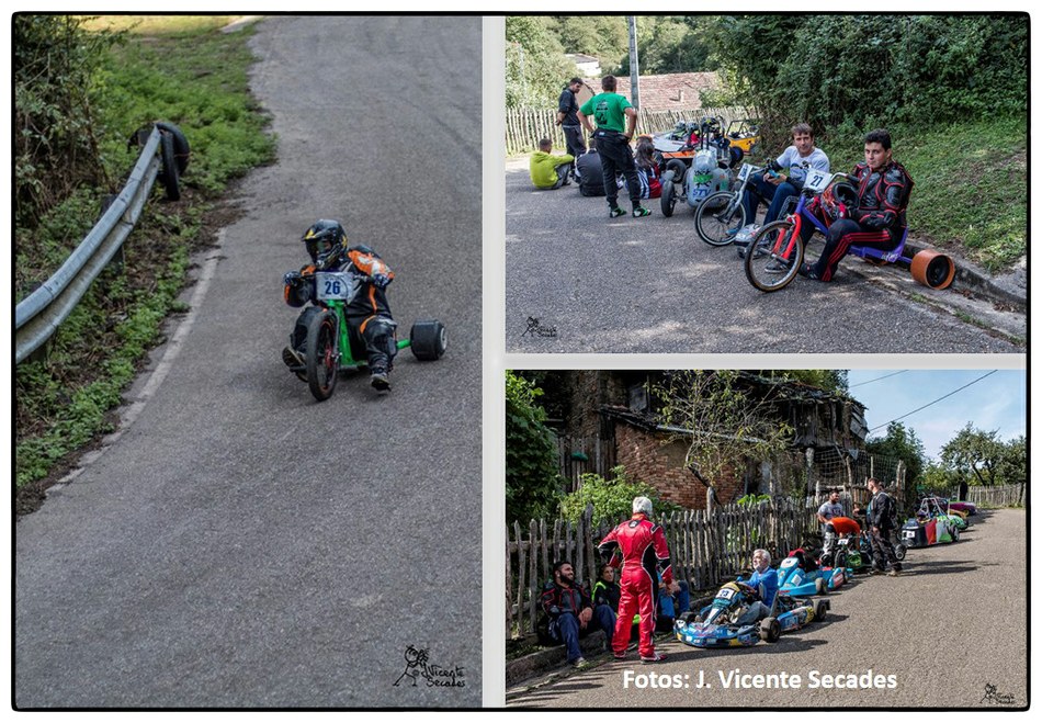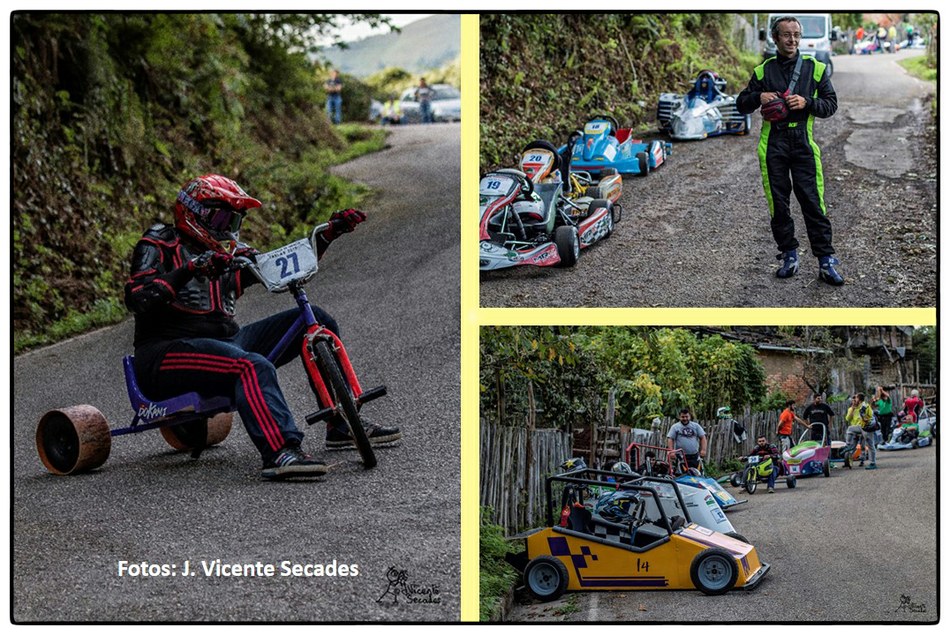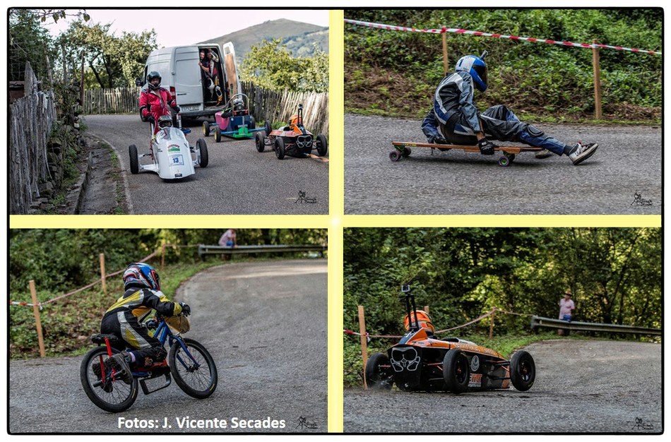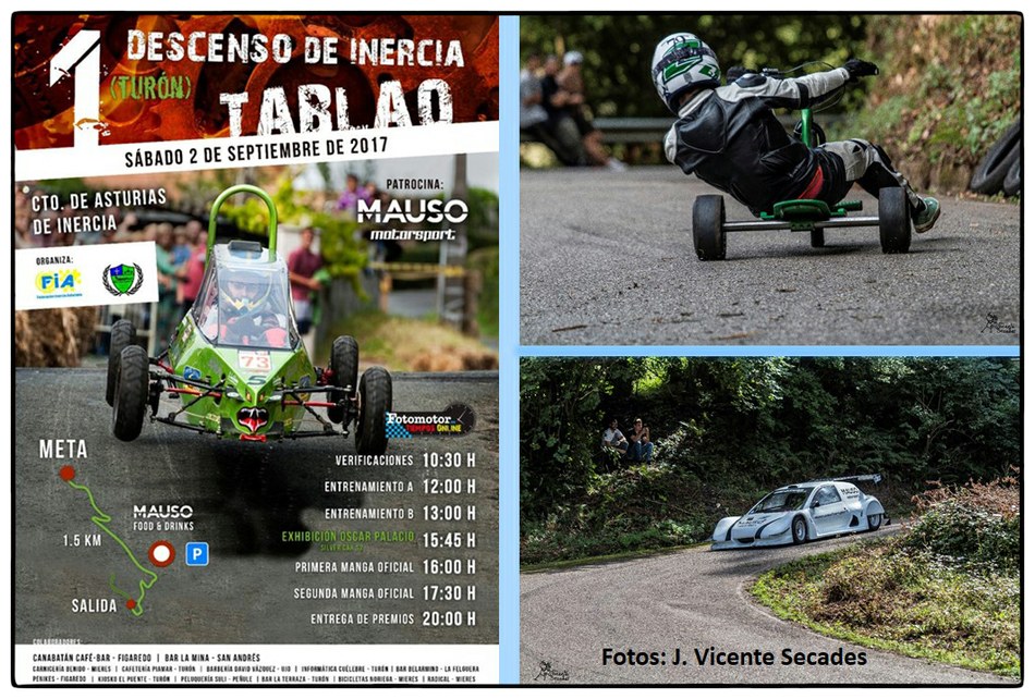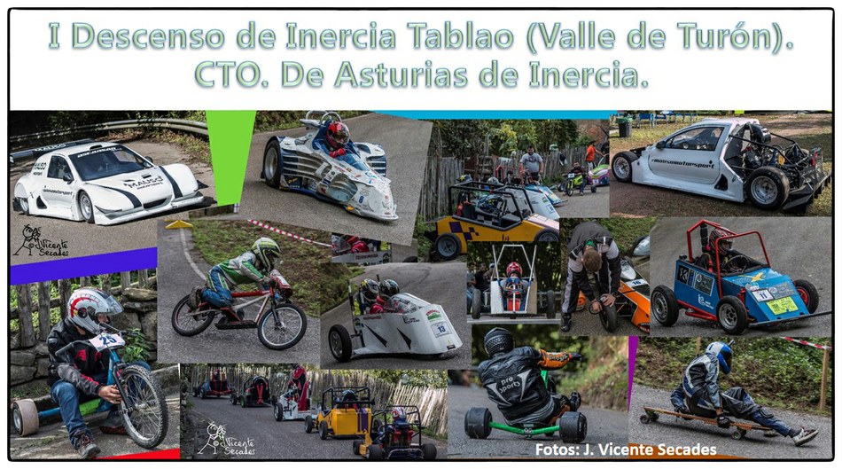 No se puede imaginar mejor pendiente y tan sobresalientes curvas como las dibujadas por la bajada de Tablao. Hubo tiempos en que lo más transitable eran los angostos caminos, tantas veces lodosos, o los inclinados planos vacíos de actividad minera. Tablao arriba, Villapendi y la Felguera abajo. Hoy demostración insólita de la fuerza de la inercia, la bajada a toda marcha la escenifican una retahíla de artefactos rodantes desbordantes de imaginación. Pero no es cualquier locura porque, aunque parezca una excentricidad, existe una Federación Española de Deportes de Inercia y su parangón internacional la FISD o Federación Internacional de Coches de Inercia. Coches de inercia, carrilanas o goitiberas, bicicleta de gravedad, monopatines de descenso, trineos de asfalto o triciclos de derrape invadiendo nuestras carreteras… Son las soapbox, gravity bikes, longboards, street luges or drift trikes… Suena más cosmopolita ¿verdad ? Pues sirva este completísimo álbum de José Vicente Secades, de la primera edición, para autentificar la presencia de una verdadera competición en nuestro valle a la víspera de la segunda edición a celebrar este fin de semana.